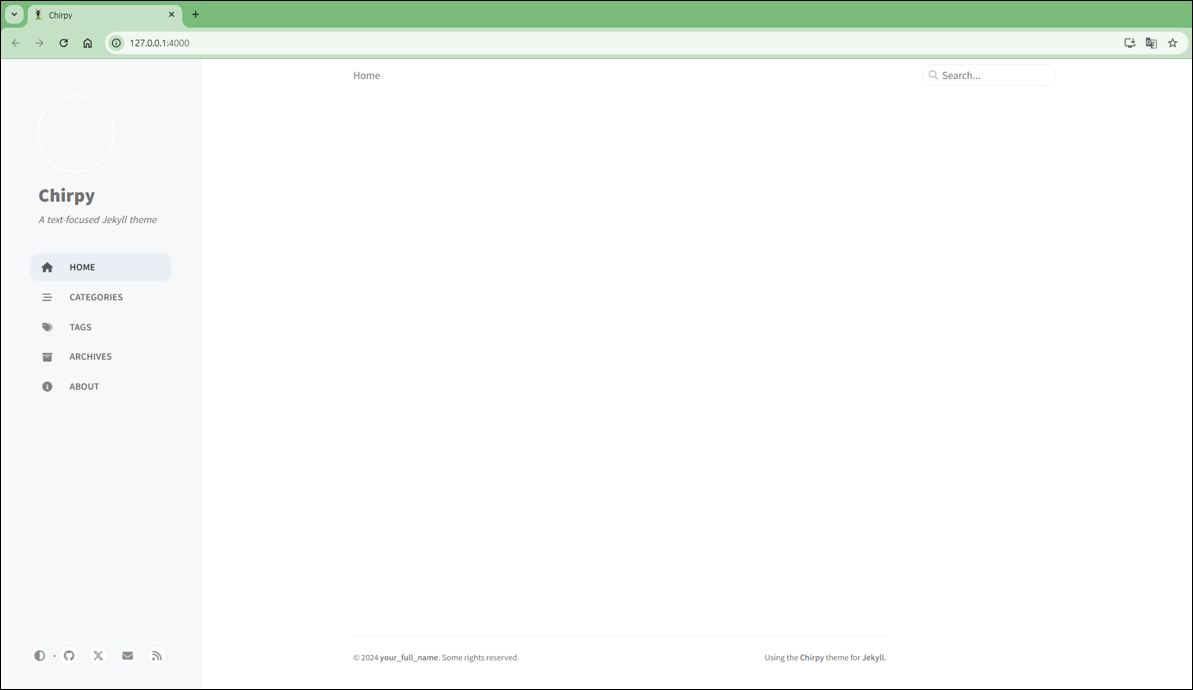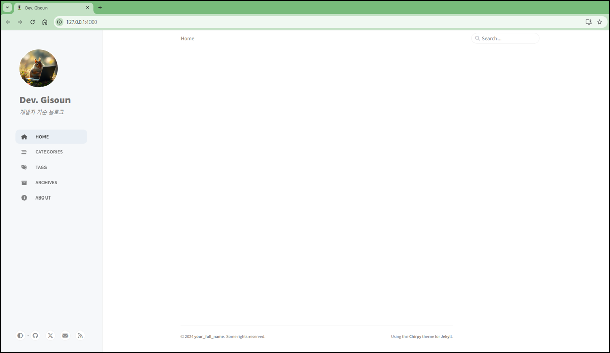 로컬 서버가 실행되었다면 브라우저 주소창에 http://127.0.0.1:4000 을 입력해 블로그를 확인할 수 있습니다.