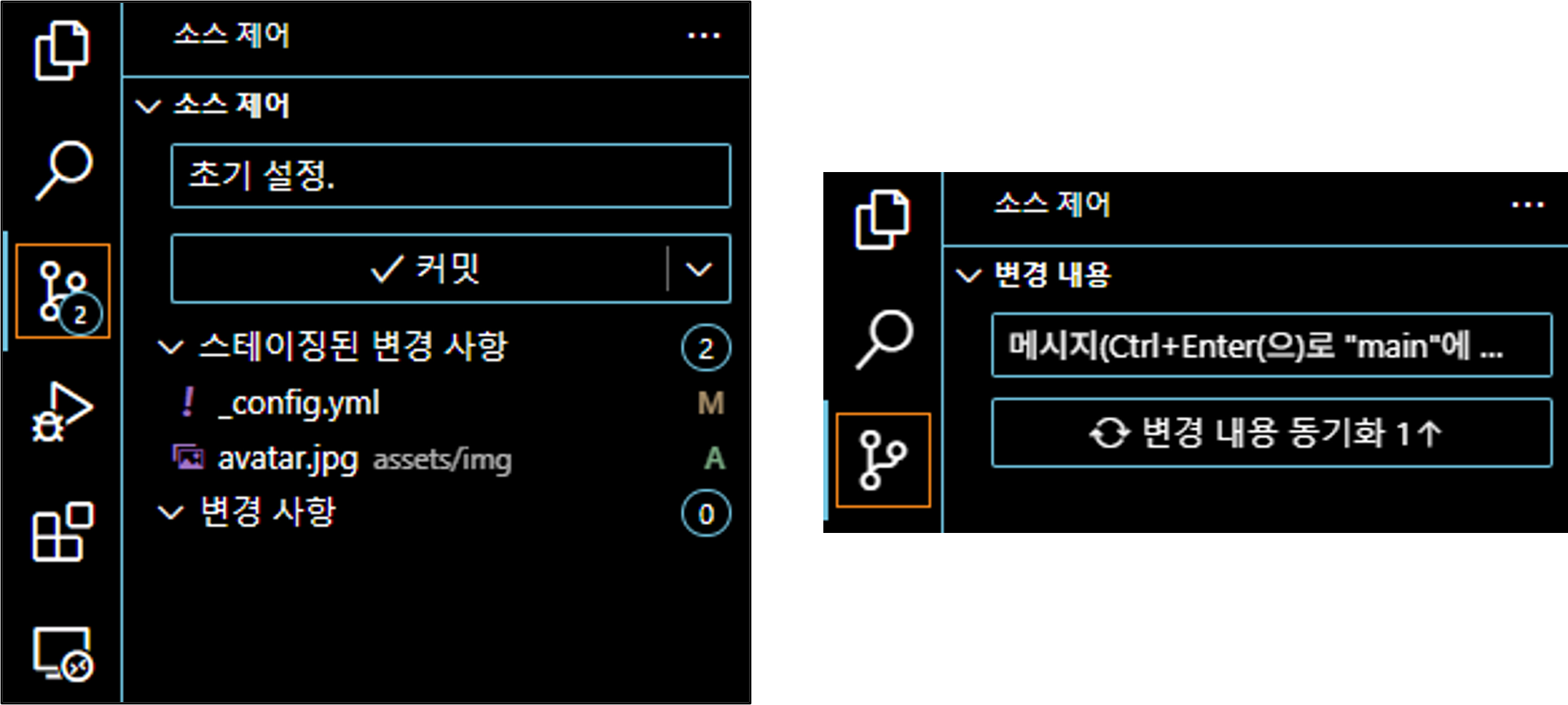 VSCode에서 Ctrl + Shift + G 단축키를 입력하여 ‘소스 제어’로 이동 후 변경 사항을 반영할 파일들을 추가하고 커밋과 변경 내용 동기화 버튼을 클릭하여 커밋 및 푸쉬를 해줍니다.