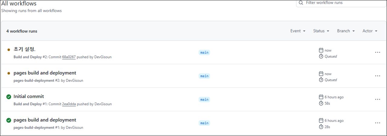Github 블로그 리포지토리의 Actions 페이지로 돌아가면 변경된 사항들에 대해서 빌드 및 배포를 진행하는 것을 볼 수 있습니다.
