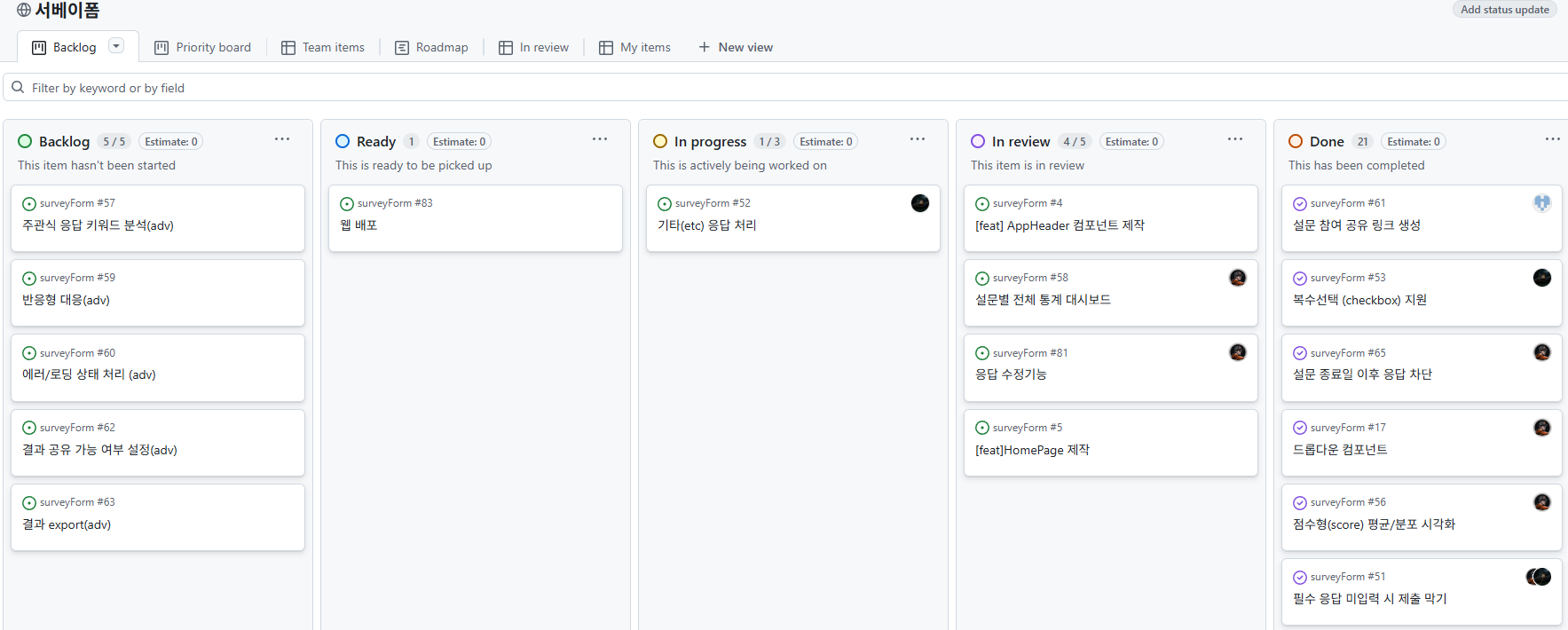 지난 주차에 이어서 이번 주차에도 팀 프로젝트를 진행하였습니다. 이번 주차에는 기반이 어느정도 갖춰진 설문 폼에 디테일을 더하여 프로젝트를 다듬거나, 추가적으로 필요한 기능을 구현하는 식으로 각자 임무를 맡았습니다.