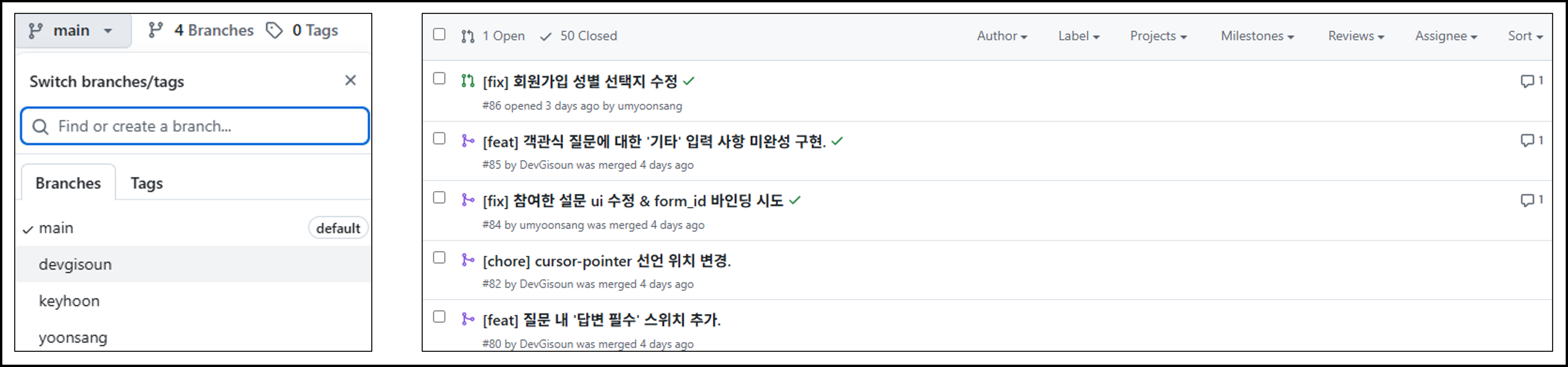 또한, 팀원별 Branch 를 분리함으로써 다른 팀원의 작업에 영향을 주지 않게끔 하여 프로젝트의 안정성을 챙기고, Pull Request 를 적극 활용하여 팀원 간의 원활한 소통 및 코드 리뷰를 통해 프로젝트의 품질을 향상할 수 있었습니다.