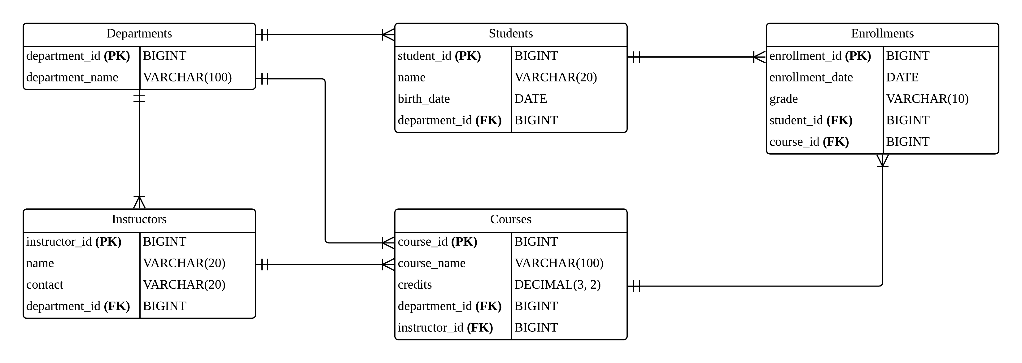 엔티티:Departments,Instructors,Students,Courses,Enrollments엔티티로 구성됩니다.N:M 관계 해결: ‘한 학생은 여러 과목을 수강’하고, ‘한 과목은 여러 학생이 수강’하는 다대다(N:M) 관계가 존재합니다. 이 관계를 해결하기 위해 중간에Enrollments라는 브릿지 테이블(Bridge Table)을 두었습니다.참조 무결성:Students,Courses,Instructors테이블이 모두Departments테이블을 참조하고,Enrollments테이블이Students와Courses를참조하여 데이터의 일관성을 유지하도록 설계했습니다.