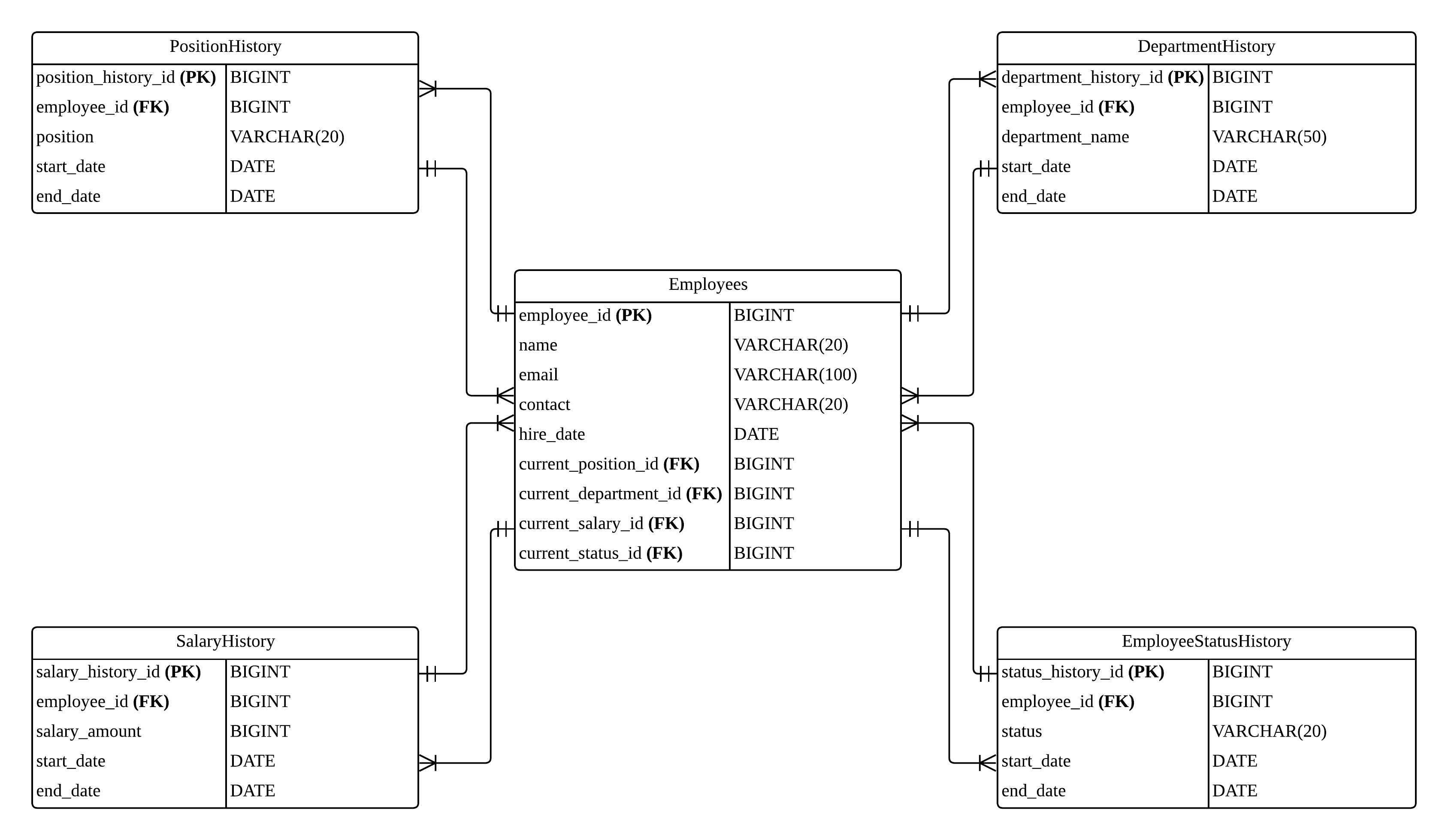 중앙 엔터티:Employees테이블을 중심으로 모든 데이터가 연결됩니다.이력 관리: 직급(Position), 부서(Department), 급여(Salary), 고용 상태(EmployeeStatus)의 변경 내역을 각각의History테이블에 저장하도록 설계했습니다.Employees테이블과 각History테이블은 1:N 관계를 가집니다.현재 상태 조회 최적화:Employees테이블에current_position_id,current_department_id등 현재 상태를 가리키는 외래 키(FK)를 추가했습니다. 이를 통해 복잡한 이력 조회 없이도 직원의 현재 정보를 빠르고 간편하게 확인할 수 있습니다.